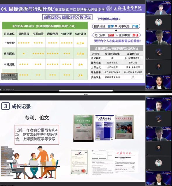决赛共分为个人展示和评委提问两个环节,规划组参赛选手配合进入决赛时提交的作品,进行生涯规划主题陈述,选手们紧密围绕自我认知、职业认知、职业决策、计划与路径、评估调整等板块内容向评委及观众展示自我职业生涯规划;成长组参赛选手通过PPT和视频等形式展示《个人成长档案》,介绍成长实践过程和收获。评委们对每一位参赛选手进行提问,对选手的规划合理的部分给予肯定,也对选手在规划中的不足提出了建议,选手们结合实际从容回答,充分展示自我风采,在线观摩的同学们反响热烈,纷纷表示受益匪浅。