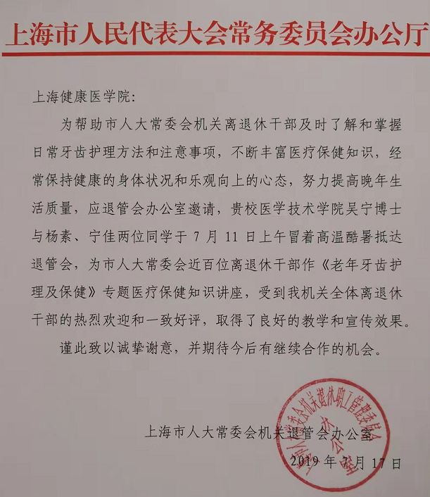 会后,市人大常委会机关退管会领导对我校吴宁教授冒着高温带队为老干部提供专业知识服务的行为表示高度肯定和表扬,并表示期待下一次合作。2019年7月17日,我校收到了来自上海市人民代表大会常务委员办公厅发来的感谢信。