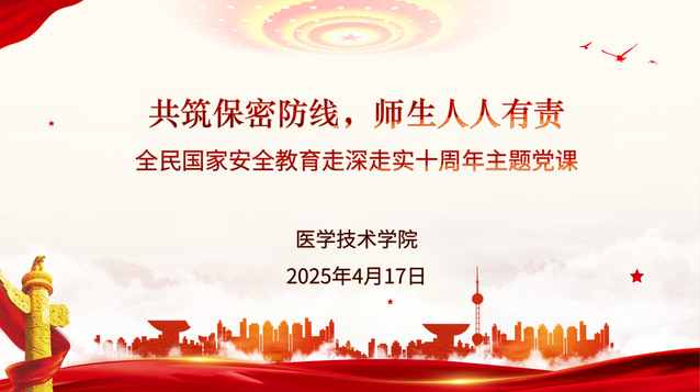 为了不断增强全院师生的国家安全保密意识和能力水平,筑牢新时代维护党和国家秘密安全的校园防线,在第十个全民国家安全教育日来临之际,医学技术学院精心组织了“全民国家安全教育走深走实十周年” 主题党课。学院领导班子、党支部书记、专业主任、教研室主任及特邀关工委委员参加学习,党课由学院党总支书记姚谷芳主持。