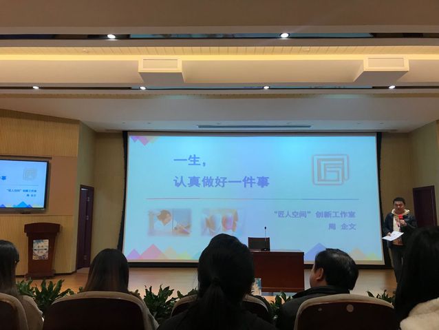 首先王凯老师以谢嫣然的事迹为例,与同学们分享了“敬业、精益、专注、创新”的“工匠精神”。随后介绍了由班导师周企文老师领衔筹建的“匠人空间”创新工作室-----旨在通过组建一支具有“一生为义,传艺一生”职业精神的指导团队,和同学一起秉承着“一生,认真做好一件事”的执着工匠精神,共同进步!