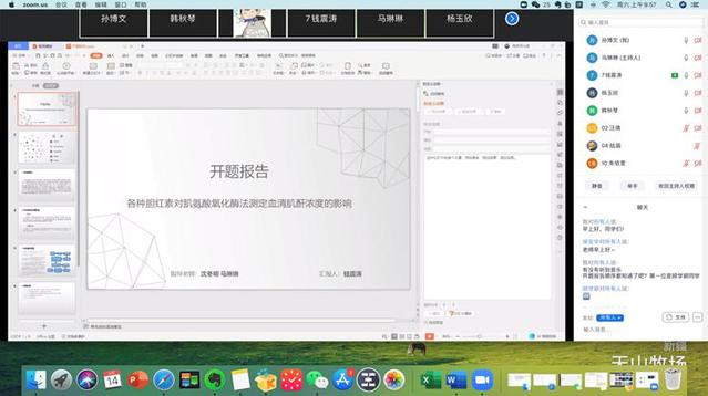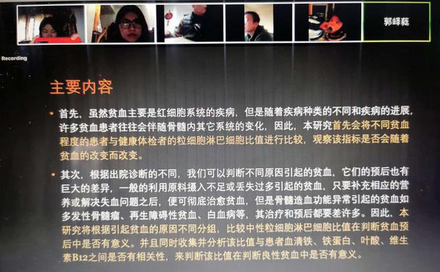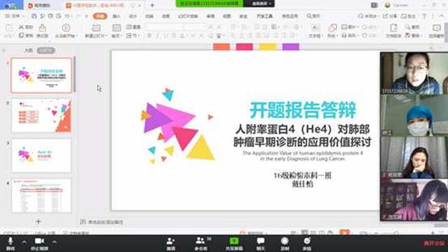 经过前期准备后,12-13日两天,临检血液、微免、生化、病理生物等四个答辩小组在各组长的带领下,利用ZOOM在线视频平台,组织各小组学生按顺序进行了视频答辩。整个答辩汇报过程非常顺利,有8位医院导师来参加了开题,并作了认真的听讲和交流。学生们都事先做了充分的准备,PPT制作精良,所有学生对自己的课题都比较熟悉,思路清晰,汇报过程中能够回答老师的问题。有部分同学的汇报达到了学术报告的水准,开题报告撰写规范,内容详实,思路清晰,具有相当高的水平。