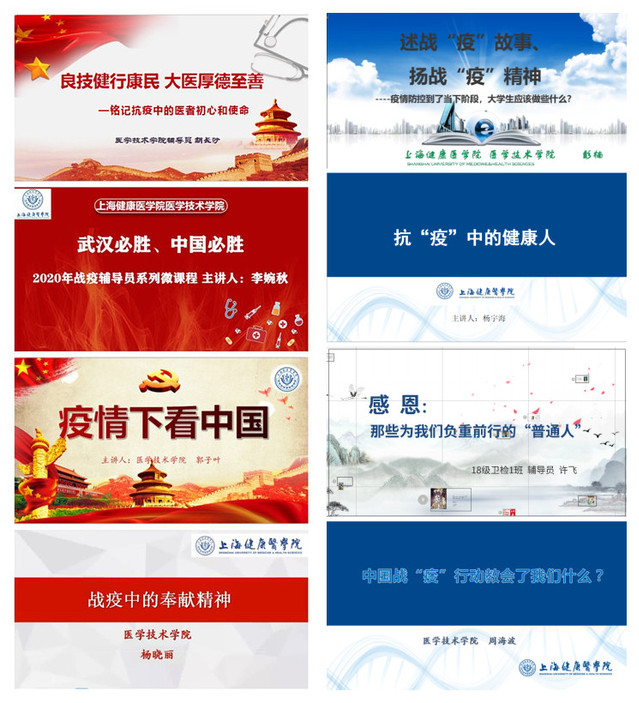 在完成线上日常学风检查的同时,学院辅导员们发挥各自特长、积极备课,大学生心理健康教育课、大学生职业生涯规划教育与就业指导课、形势与政策课都活跃着他们的身影。与此同时,辅导员们注重自身科研能力提升,主动投入到团市委课题、学校党建课题的申报中,学院共提交了4项课题申报书,其中郭子叶老师的《新时代医学生爱国主义教育现状及对策研究》予在校级党建课题立项。此外,在学工部组织下,学院辅导员队伍结合战“疫”中鲜活感人的案例和身边故事,精心制作《良技健行康民,大医厚德至善》、《武汉必胜、中国必胜》、《感恩:那些为我们负重前行的“普通人”》等系列线上战“疫”微课。