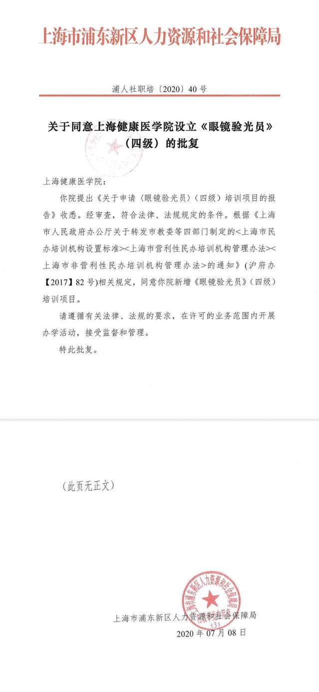2020年7月14日,上海市浦东新区人力资源和社会保障局批复我校正式获得《眼镜验光员》(四级)培训项目。眼视光专业将在此基础上不断提高专业建设质量和水平,不断提升服务经济社会的能力,培育更多高素质应用型人才!