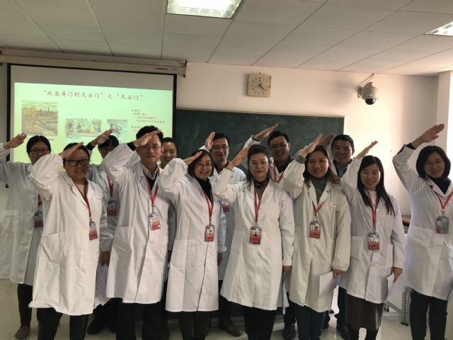 最后,全体党员教师高声合唱《走进新时代》,唱响复兴之门。我们体会到:昔日的愁眉,变成今天的欢颜;曾经的迷惘,变成了自信的脚步。在光明的照耀下,中国已站在时代前列,我们倍感自豪!