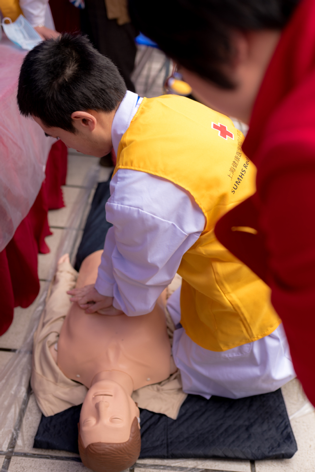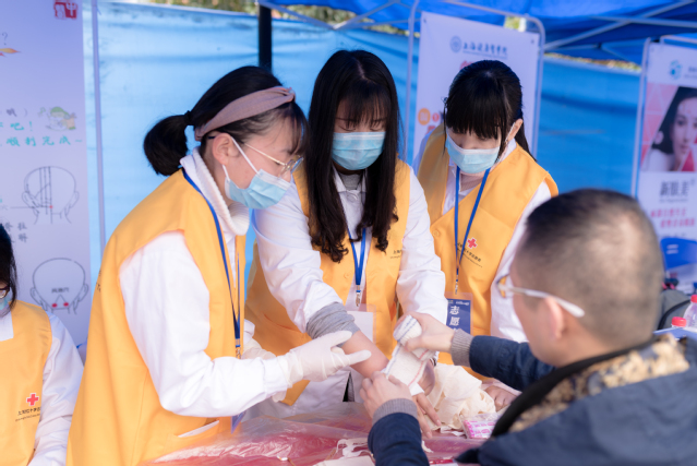 活动开始后,我校的志愿服务点人头攒动,校青年志愿者协会的志愿者们为市民提供了测量血糖血压和制作中药香囊的服务。并在测量完血压血糖后针对测量结果为市民提出饮食及锻炼等方面的建议,同时志愿者们还为市民提供了包含荆芥穗、紫苏、丁香、苍术、艾草五味药材在内的“紫荆”香囊,并在市民自主制作的制作过程中进行中药药效的相应讲解现场氛围十分温馨。校红十字会学生分会的志愿者们在现场展示了心肺复苏术的技能,并让广大市民们亲身体验其过程。让市民们了解到在突发情况下如何更好的在黄金时间开展自救与他救。同时,同学们还进行了伤口包扎的现场教学,指导市民关于日常烫伤等的包扎方法。此外,红十字会学生分会的同学们还为广大市民提供中医推拿及理疗服务并传授肩颈操,帮助白领以及老年人更好的预防并缓解肩颈疼痛。