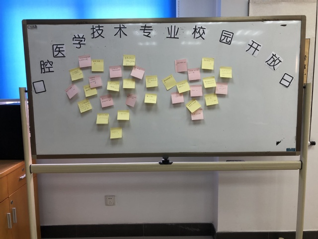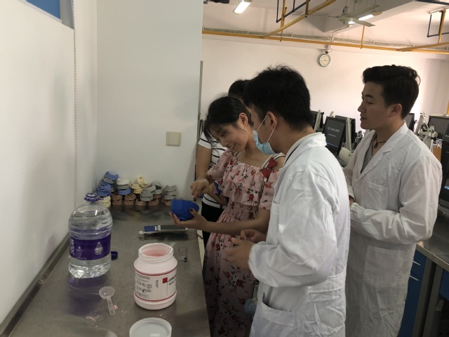 首先,志愿者从3号楼一楼大厅迎宾将刚刚经历过高考洗礼的高中毕业生和家长们引导至电梯并抵达2楼大厅,体验者签到后领取专业介绍,并在专业老师和志愿者的带领下,参观上海市口腔医学技术开放实训中心,并了解口腔医学技术专业概况及义齿修复的实地场景。参观完毕后,引导体验者们进入口腔实训室亲自体验印模制取环节。为了增加趣味性,特地将项目设计为手指取模。志愿者详细讲解制取印模和模型在口腔治疗和假牙制作中的重要作用,并辅助体验者完成印模调拌,指导体验者将手指插入凉爽的印模材料中,待印模成型后拔出手指,并灌注出石膏模型,待石膏硬固之后,每位体验者就可以获得一个一模一样的手指模型了。在等待的过程中,体验者们还观赏了“巴氏刷牙法”和CAD-CAM 3D制作义齿的视频。最后,体验者们写下了参加此次活动的体会,分享给后面的来宾。