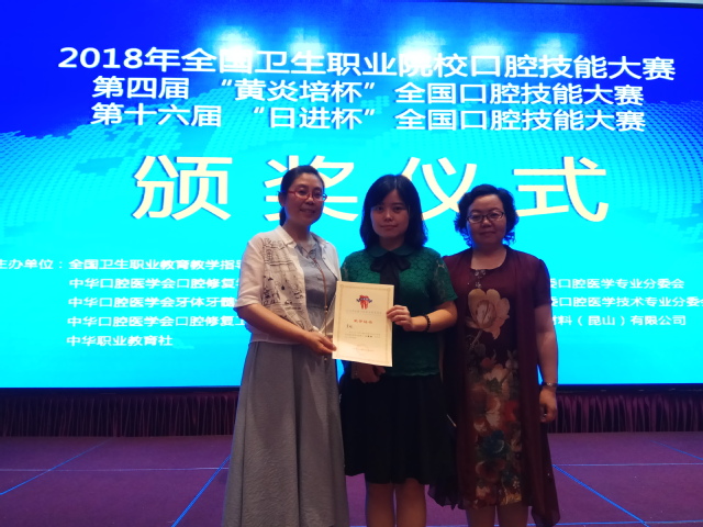 由全国卫生职业教育教学指导委员会、中华口腔医学会口腔修复工艺学专业委员会、中华口腔医学会口腔修复学专业委员会、中华口腔医学会牙体牙髓病学专业委员会主办,日进齿科材料(昆山)有限公司协办,开封大学院承办的2018年全国卫生职业院校口腔技能大赛、第四届“黄炎培杯”全国口腔技能大赛、第十六届“日进杯”全国口腔技能大赛及首届口腔职业院校教师授课技能展示于6月29日-7月1日在河南开封大学如期举行。我校学生再次蝉联全口排牙单项赛金奖,专业教师董晛获青年教师授课技能展示二等奖。